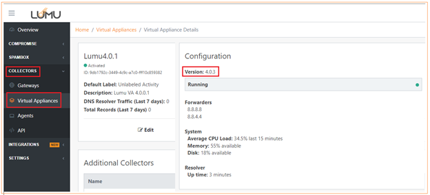 To check the appliance version in the Lumu Portal, go to: Collectors > Virtual Appliances and clicking in the VA to view its configuration details: