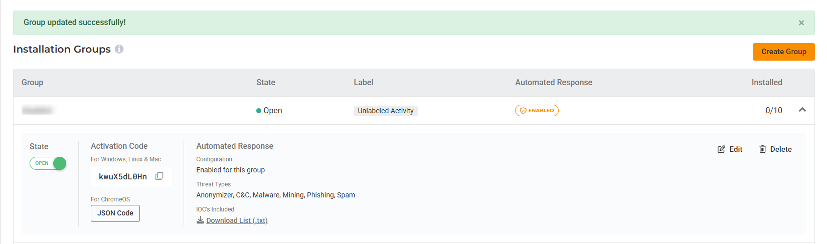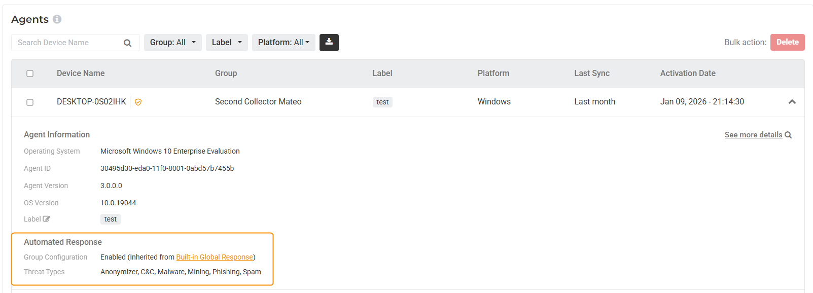 When viewing the details of an Agent Group, you can see whether the Automated response is enabled and which configuration is the group using.