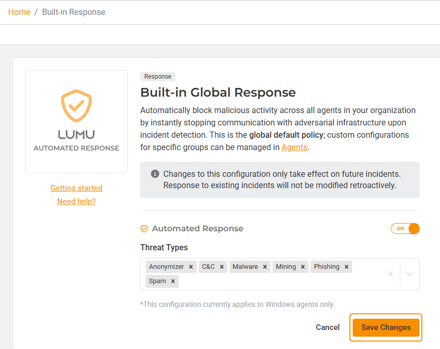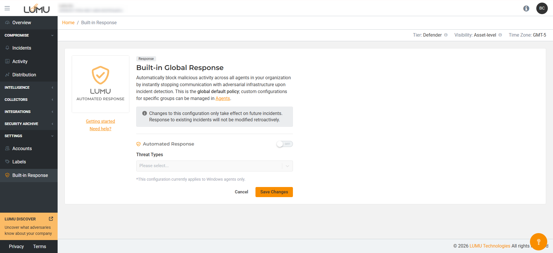 Only administrator users can set up the Built-in Automatic Response for Lumu Agents.