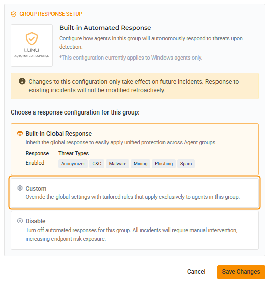 Applying a custom response policy to a group overrides the Global Built-in configuration. Agents within this group will operate exclusively according to the specific rules defined here and will no longer inherit settings from the Built-in Global Response.