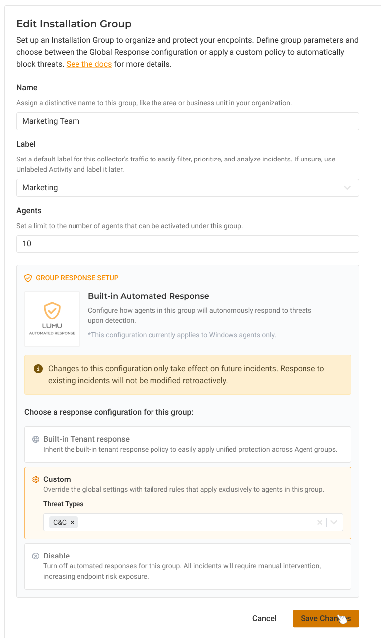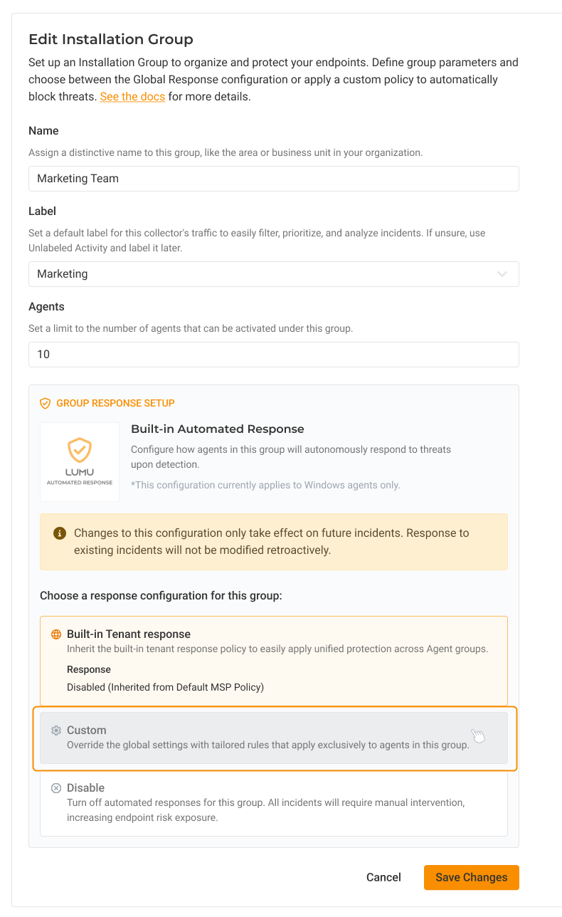 Applying a custom response policy to a group overrides the Global Built-in and the Tenant configurations. Agents within this group will operate exclusively according to the specific rules defined here and will no longer inherit settings from other configurations.