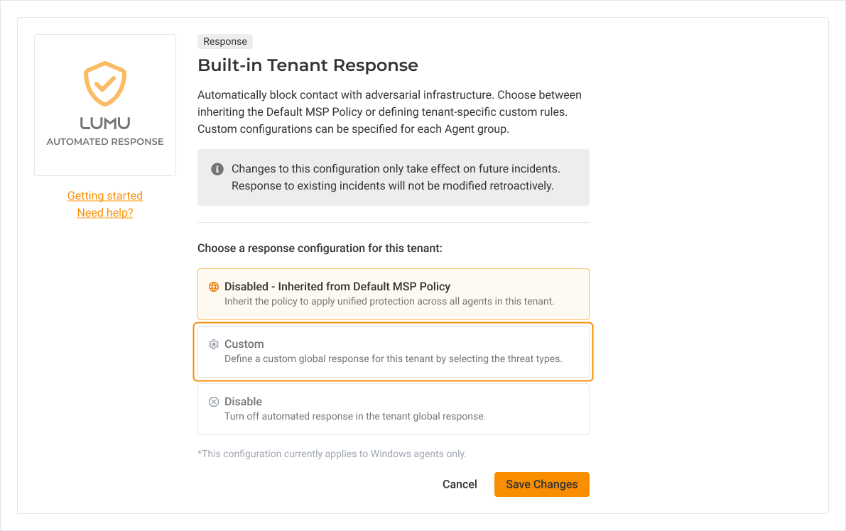 Applying a custom response policy to a tenant overrides the Global Built-in Response. Agents within this group will operate exclusively according to the specific rules defined here and will no longer inherit settings from other configurations.