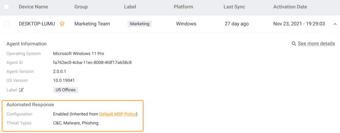 When viewing the details of an Agent Group, you can see whether the Automated response is enabled and which configuration is the group using.