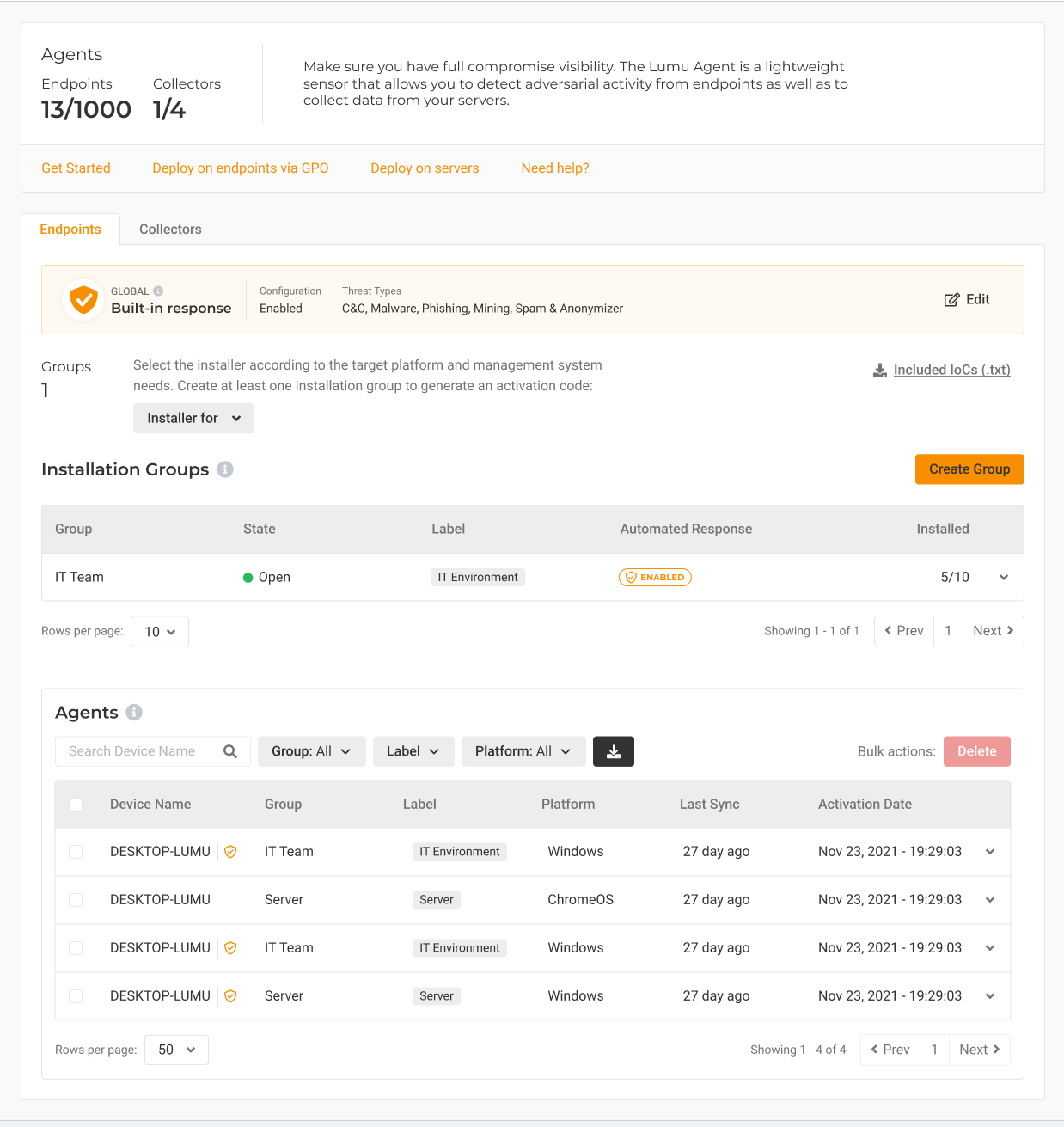 The Lumu Agent can be deployed easily to your entire user population, and you can control groups and status of each agent at a glance through the Lumu Portal.