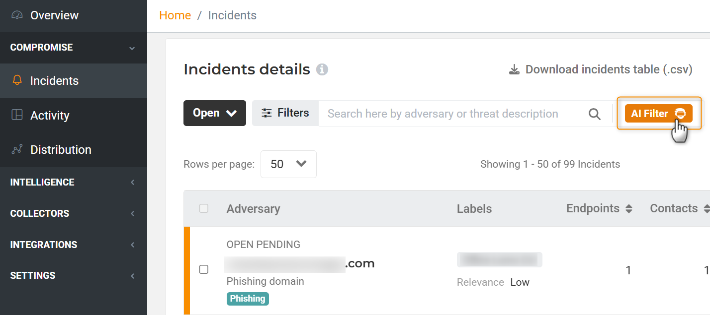 You can find Lumu’s AI Filter in the Incidents view. Scroll down to find the usual search bar and beside it, you will find the AI Filter button.