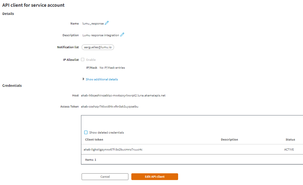 An Akamai API client is required to push IOCs using its ETP Config API. To create an API client, follow these steps in the Akamai Control Center: