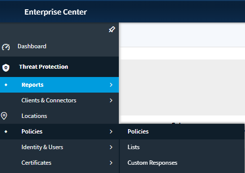 1. Open the hamburger menu at the top left side of the screen. Click on the Enterprise Center menu under the ENTERPRISE SECURITY section.2. In the Enterprise Center window, click on the Policies menu under the Threat Protection > Policies section.3. Review your browser bar. Look for the number after the /etp/ string.Take note of this number. This will be required for setting up the integration script.
