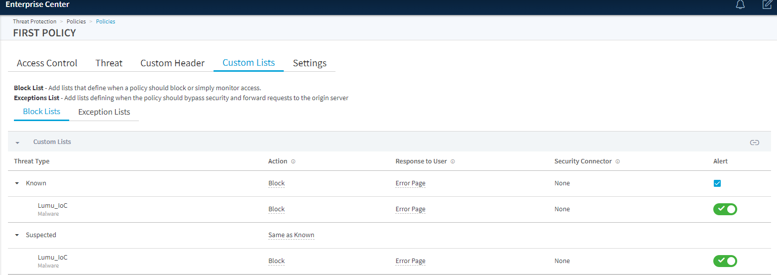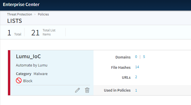 After running the integration, you will see a new custom list named Lumu_IoC under the Threat Protection > Policies > Lists module.