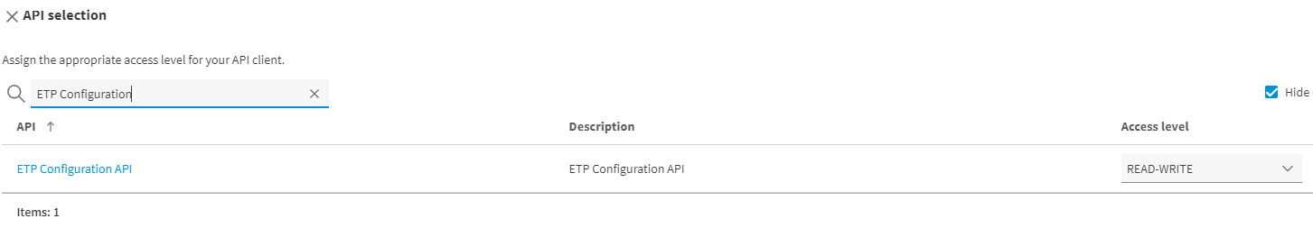 1. Open the hamburger menu at the top left side of the screen. Click on the Identity & access menu under the ACCOUNT ADMIN section.2. In the Identity and Access Management screen, click on the Users and API Clients tab. Then, click on the Create API client button.3. In the Create API client window, do the following:a. Click on the Service Account tab. Then, click on the Set API client options button.b. Fill in the required data.c. Click on the Select APIs button. In the API selection window, look for the ETP Configuration API. Set the Access level to READ-WRITE. Click on the Submit button.d. Click on the Select groups button. In the Group selection window, assign the Editor role. Click on the Submit button.e. Click on the I reviewed and acknowledge any escalation to the authorized users' permissions checkbox. Dinally, click on the Create API client button.4. Now, you will see the details for the created API client. You need to create a new credential. To do so, click on the Create credential button under the Credentials section.