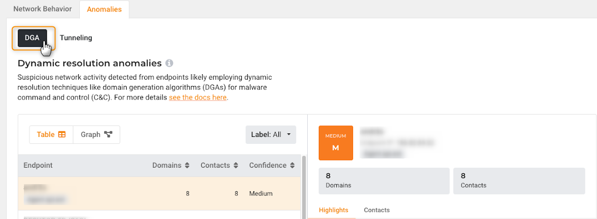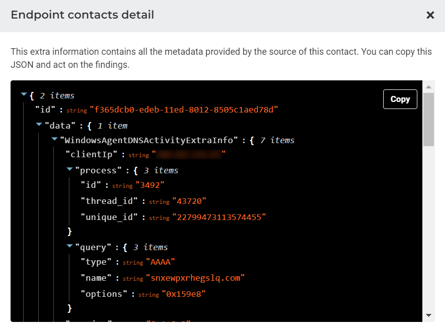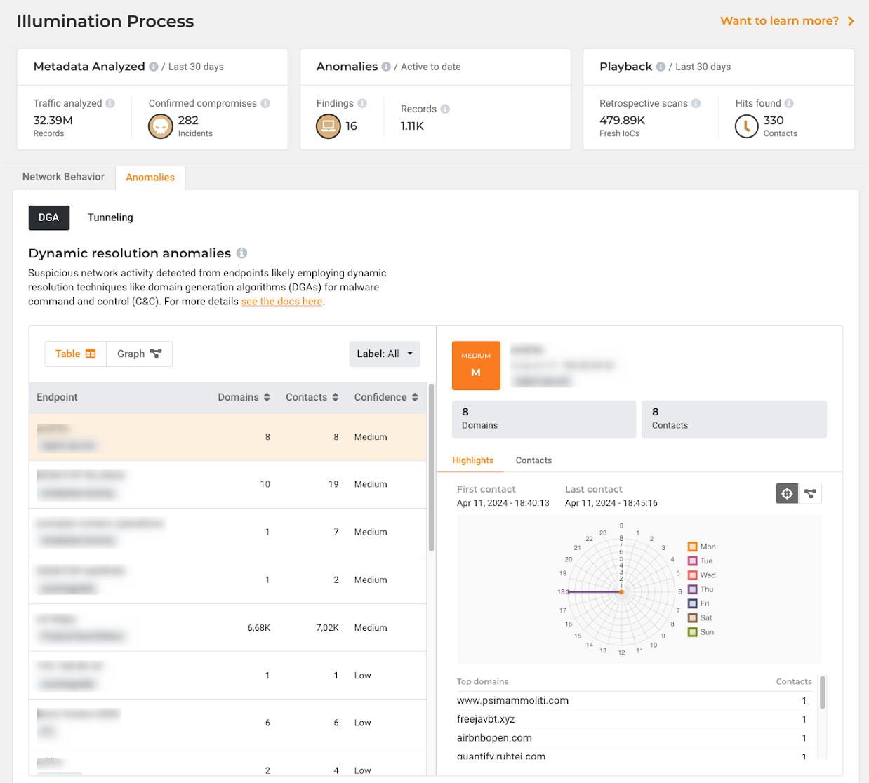 By clicking on each instance, you will have access to a radar chart that will give you context on the frequency of the contacts and the IP and label of the affected endpoint. You can use this information to check on the potentially affected device, ensure that everything is working as intended, and gain peace of mind for everyone involved.