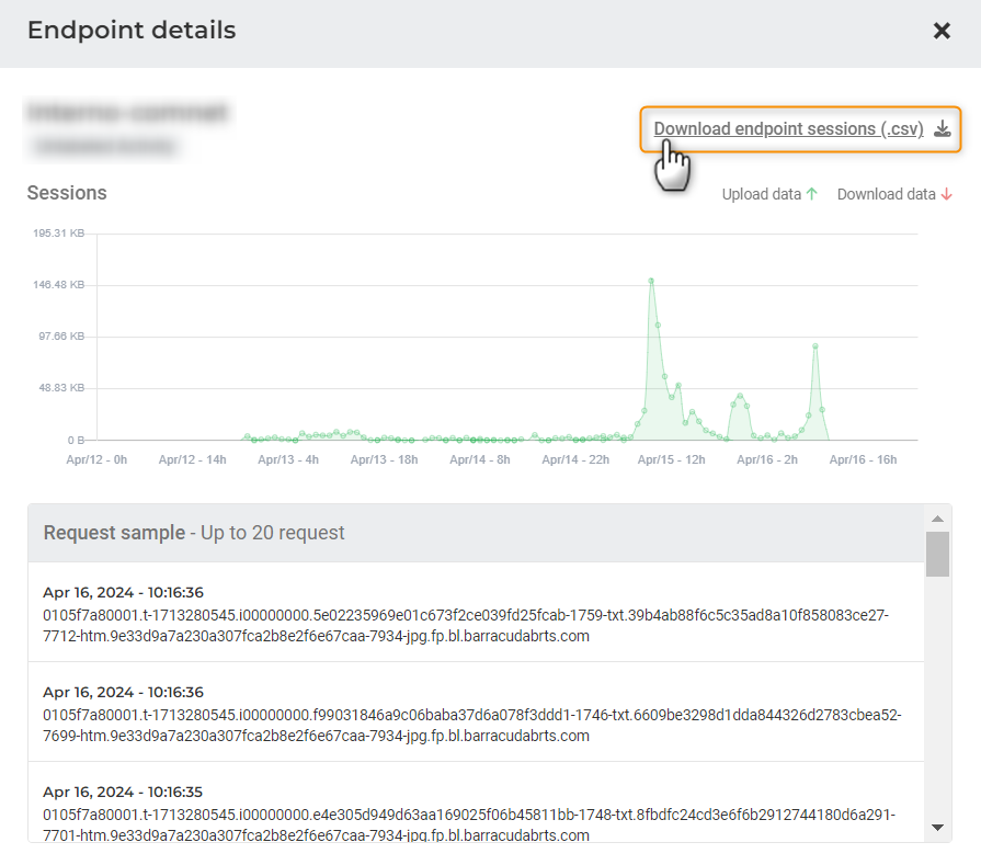This view will offer a more detailed graph alongside request samples from the communication between this specific endpoint and the potentially malicious domain. You can also download the full information regarding these sessions in the form of a .csv file.