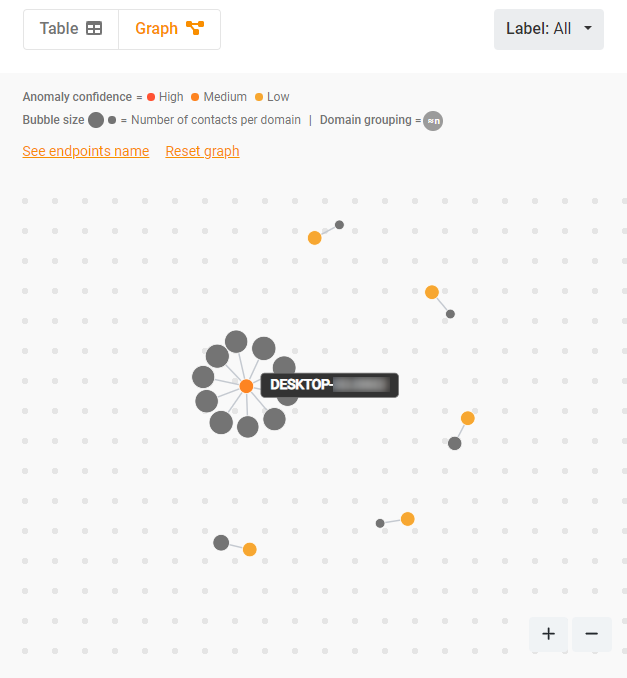 On the top right, you will find a button toggle between the radar chart, and a specific Endpoint graph that visualizes the contacts this endpoint has received. This graph is similar to the Anomalies graph outlined further in this article, but it is specific to the endpoint you have selected.