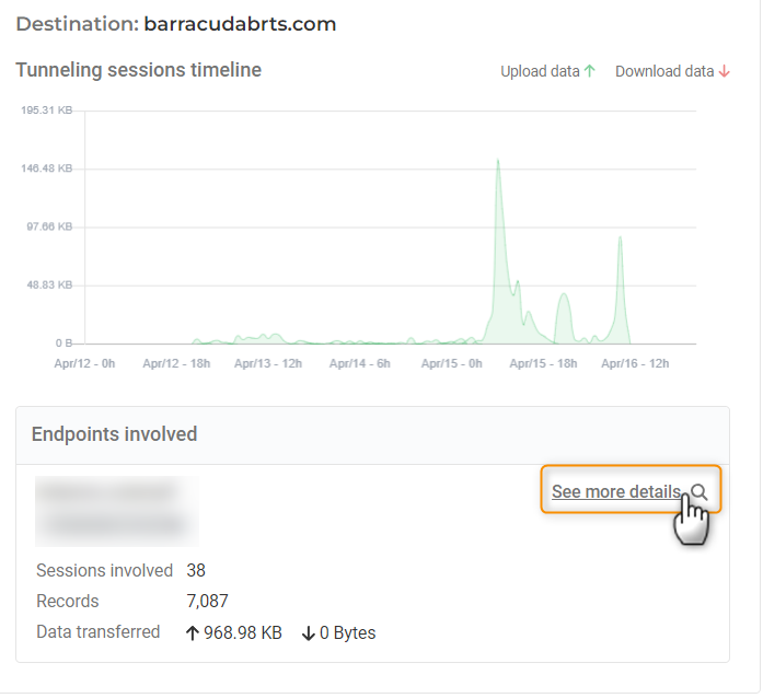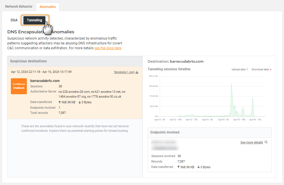 You can find additional information about the anomaly such as a graph displaying the distribution of traffic over time with the potentially malicious domains, the amount of transferred data, records, and sessions that involved the endpoint. You can access even more details by selecting the relevant option.