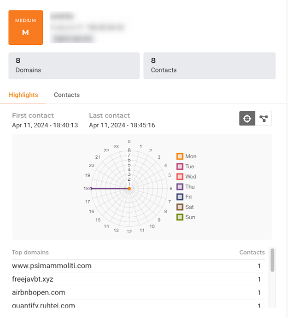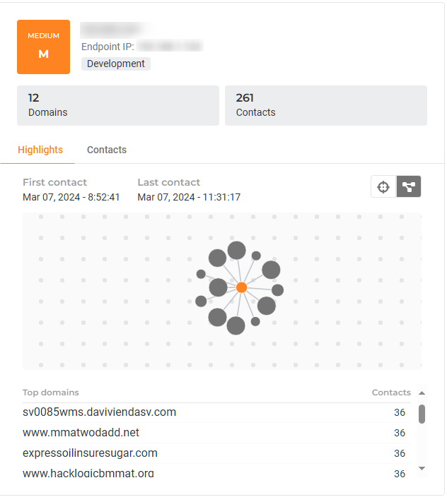 Under the radar chart, you will find a list of the Top Domains that contacted the endpoint in question, along with the number of contacts for each domain.