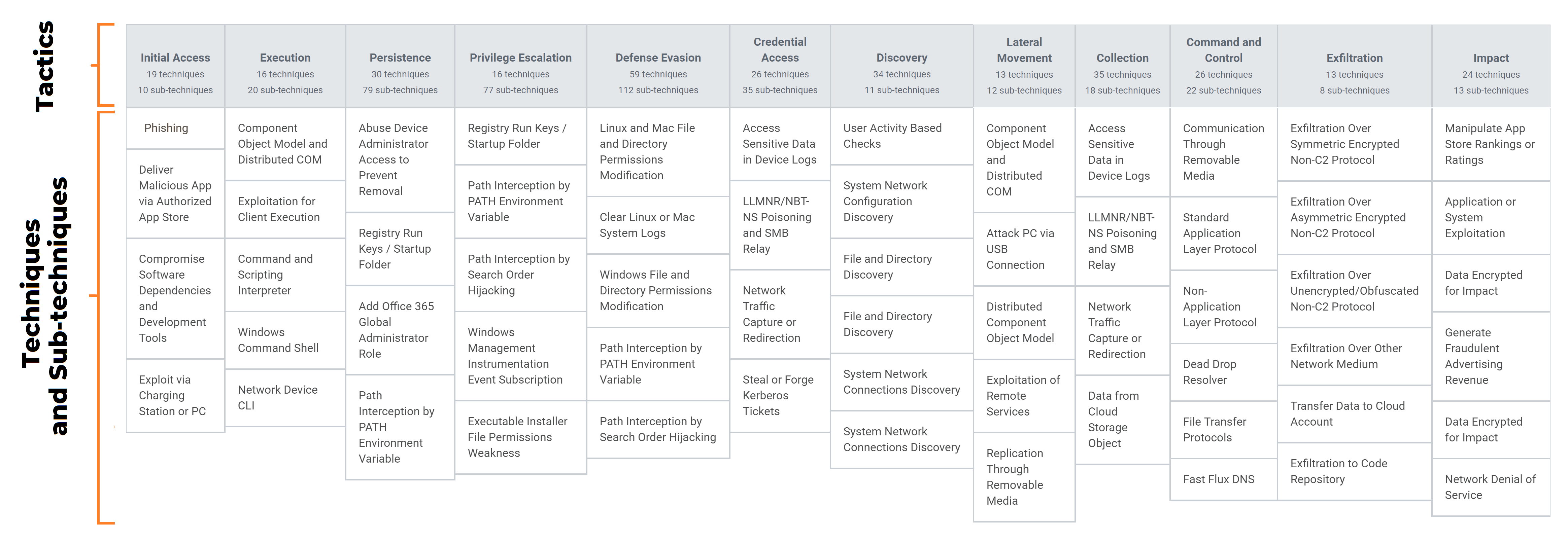 Techniques represent “how” adversaries can achieve their tactical goals and also “what” an attacker gains by completing an action. For example, the Persistence tactic can include techniques such as Hijack Execution Flow, BITS Jobs, and External Remote Services. Each of these is a single technique that attackers may use to reach the goal of persistence. In some cases, different tactics may use the same techniques. Sub-techniques are a more specific representation of the attacker’s behavior. Techniques are referenced in ATT&CK as Txxxx, and sub-techniques as Txxxx.xxx. For example, the “Use Alternate Authentication Material” technique has the ID T1550, and the sub-technique “Windows Command Shell” has the ID T1059.003.