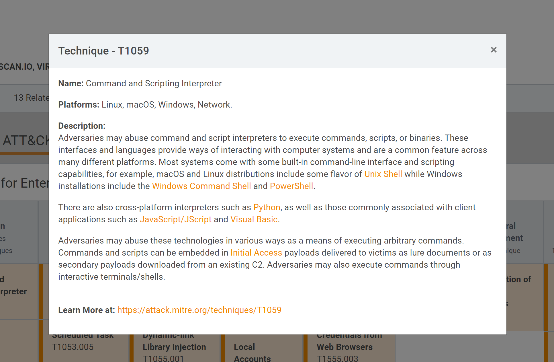 When you click on a technique or sub-technique, you can find a description, references, and research highlighting specific Procedures for describing how an adversary implements that given technique. In this area, you have the ID, name, description, the platforms affected by the technique/sub-technique, and the link from MITRE that contains procedures examples, mitigations, and references.