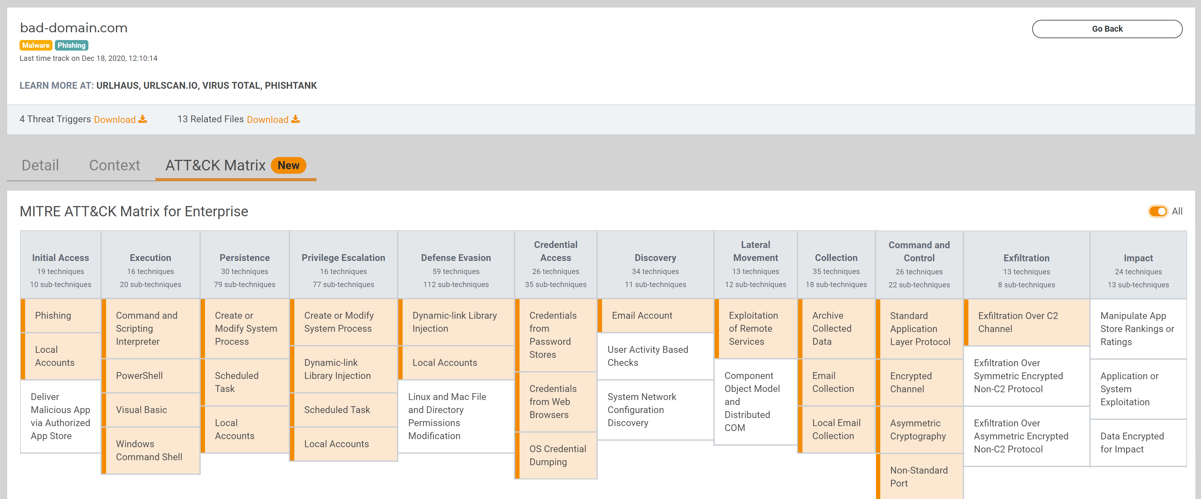 Lumu Portal provides a visualization with technical detail at the technique level and the relationship with the context around the tactical level. The ATT&CK Matrix is available for each malicious activity in the context area of the Lumu Portal. By default, the techniques associated with each incident found are highlighted in the MITRE ATT&CK Matrix. Figure 2 is an example of how the Lumu Portal presents different techniques used by a threat in an incident.