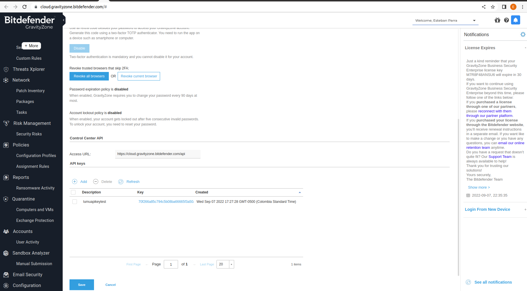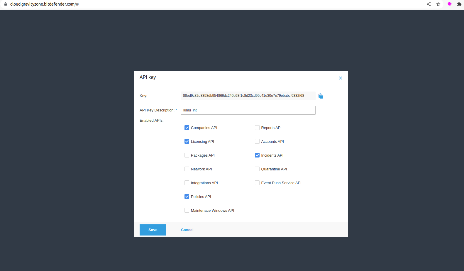 Using the Bitdefender Web console, go to the top right. In the User section, click on My Account > API Keys > Add. In the API Key window, enable the permissions Companies, Licensing, Incidents, and Policies.