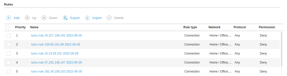 The integration creates or deletes recent Hash, FW rules and Web URLs regarding what is found in Lumu.