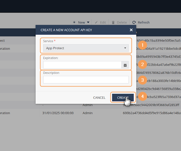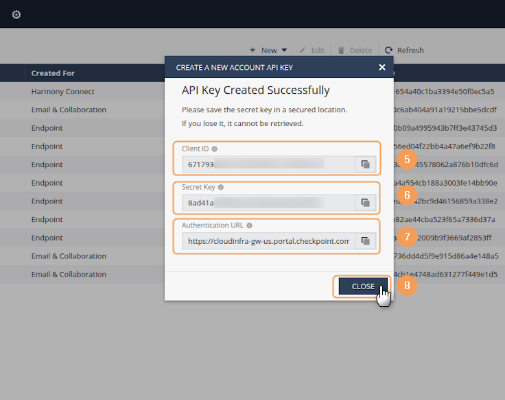 4. Fill the required information within the CREATE A NEW ACCOUNT API KEY modal as follows:a. Under Service(1), search for and select the Email & Collaboration option. You can type in the field to narrow down the options shown.b. Select an Expiration(2) date by clicking on the calendar button. Choose an expiration date based on your internal security policy guidelines.c. Under Description(3), type a distinctive description to identify the API keyd. When done, click on the blue CREATE(4) button.e. A new window will appear, containing the Client ID(5), Secret Key(6), and Authentication URL(7). Make sure you store this information safely. Once you do, click on the blue CLOSE(8)
