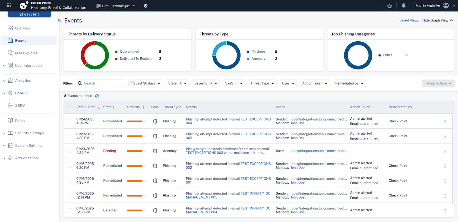 After the IOCs are uploaded to your Harmony Email & Collaboration subscription, further events will be detected and marked as Phishing attempts in the Check Point portal, under the Events header in the left hand menu.