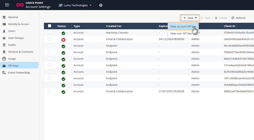 3. On the API Keys window, click the New button at the top of the page. Then click on the New account API key option.