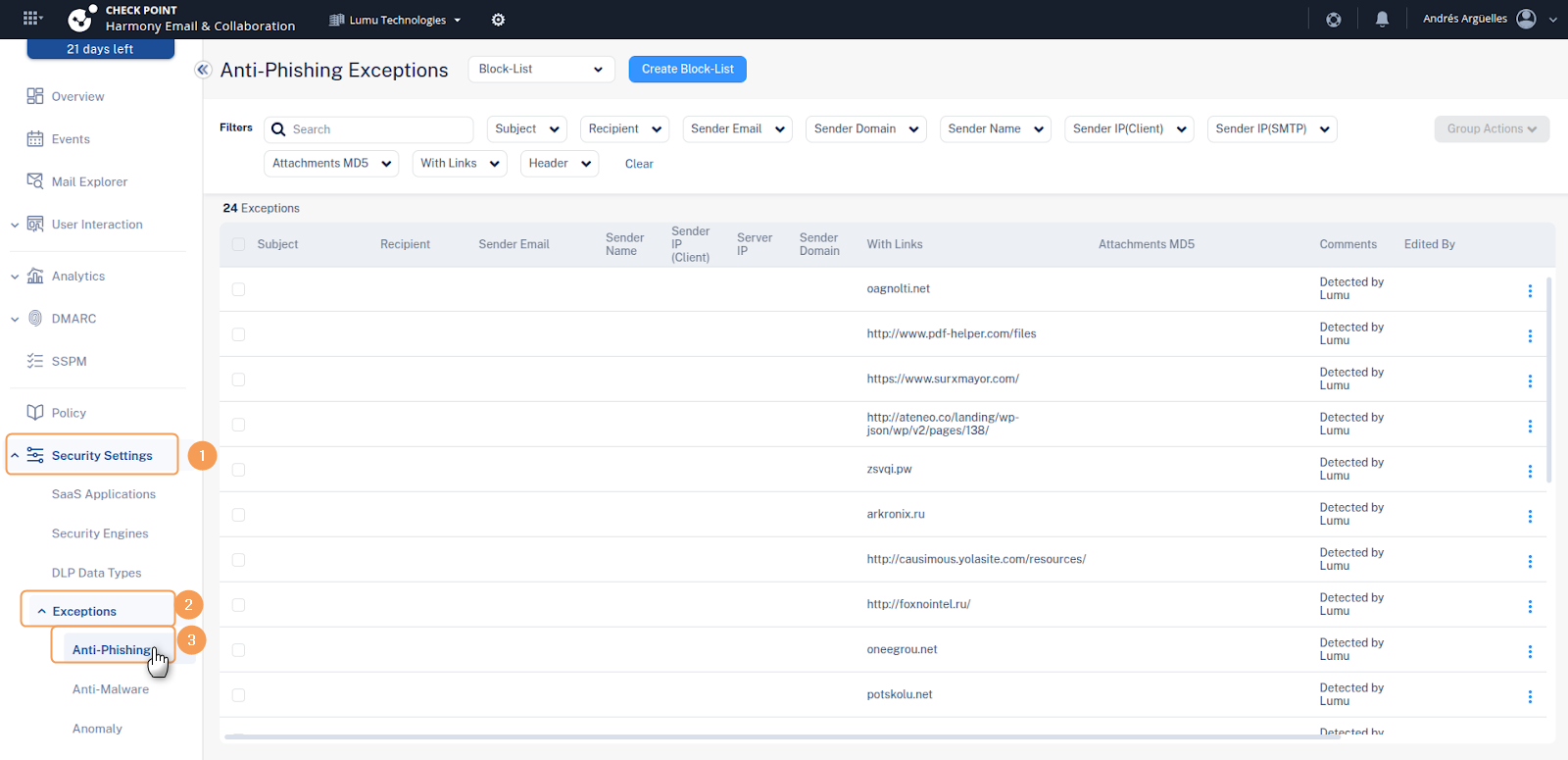 All the uploaded IOCs in form of blocklists will appear in the Anti-Phishing Block-List module under the Harmony Email & Collaboration configuration. You can get here by clicking on Security Settings on the left hand menu and clicking on the Exceptions header. The list is under Anti-Phishing.