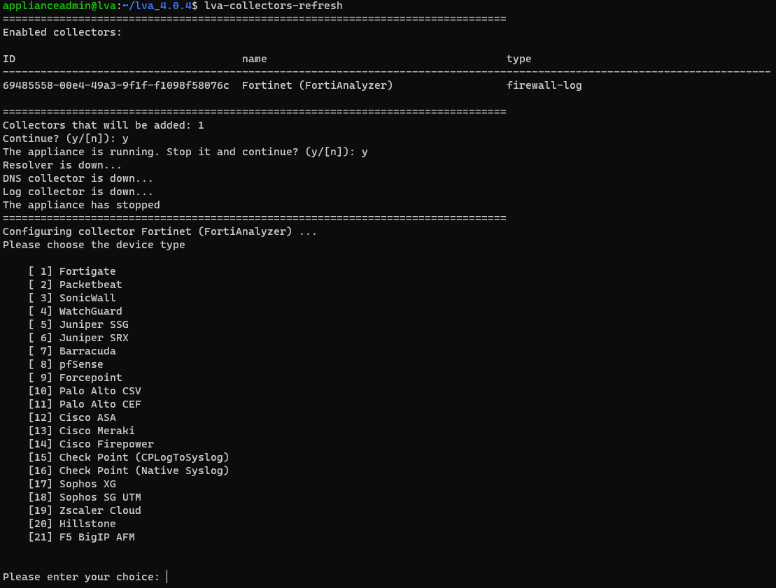 Go to the Lumu Virtual Appliance and refresh the VA Collectors settings by running the command lumu-appliance collectors refresh . If the appliance is running, it should be stopped for setting up collectors.