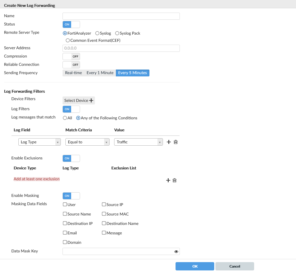 You can add up to 5 forwarding configurations in FortiAnalyzer. To add a new configuration, follow these steps on the GUI: