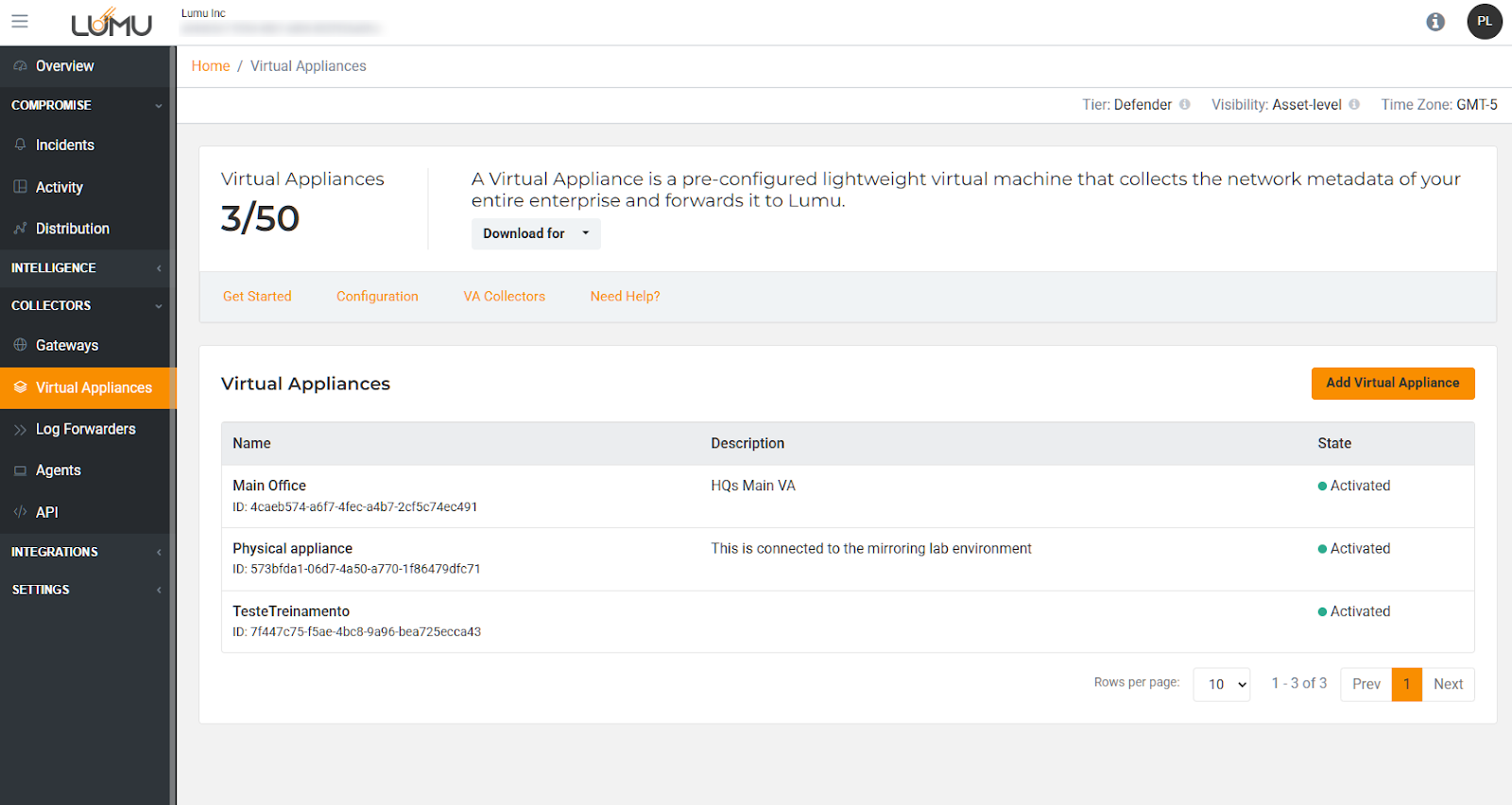 In this section of the Lumu Portal, you can manage the available collector types such as Agents, Virtual Appliances, Gateways and custom API collectors.