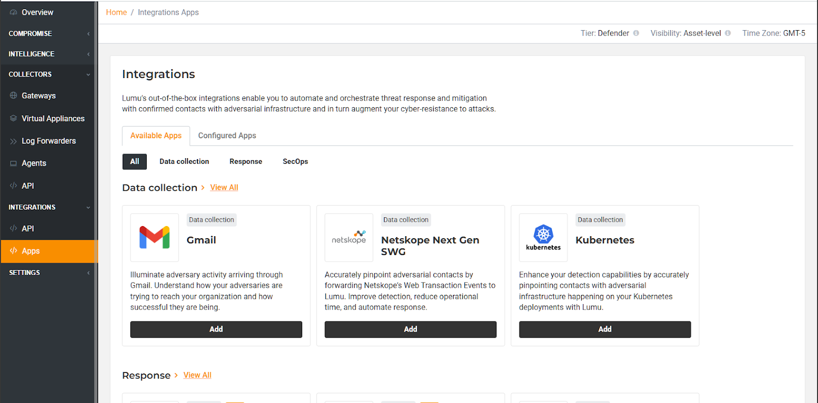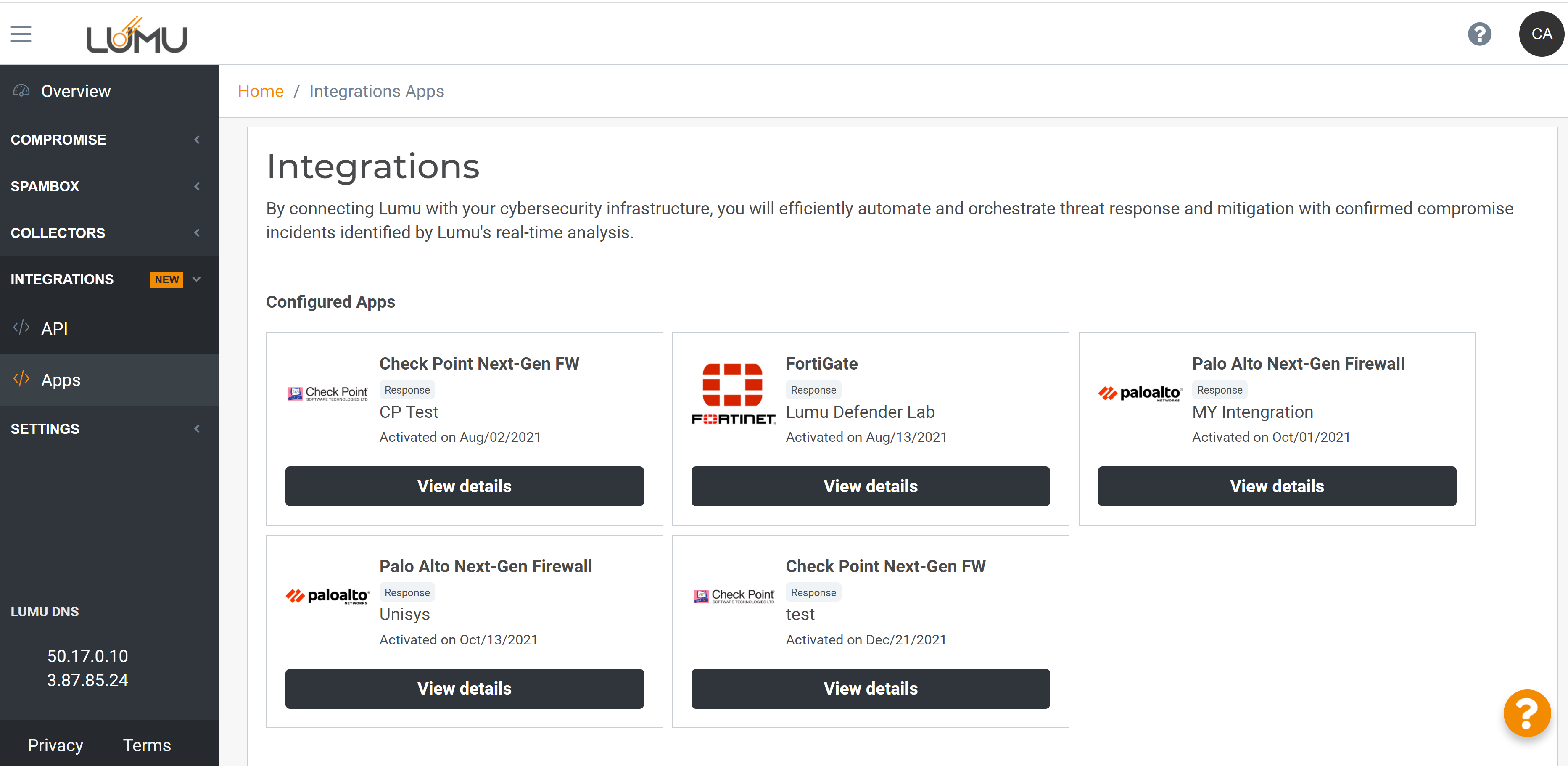 Apps refers to one of Lumu’s most powerful tools, Out-of-the-Box Integrations. These are integrations that are ready to communicate with the most popular cybersecurity vendors, enabling Lumu to operate as an essential part of any cybersecurity stack with just a couple of clicks.