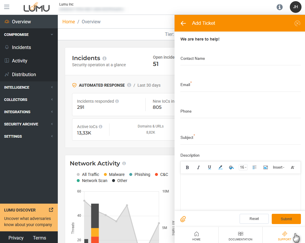 Alternatively, you can click on the Lumu Support widget on the bottom right section of the Lumu Portal and select the Support option.