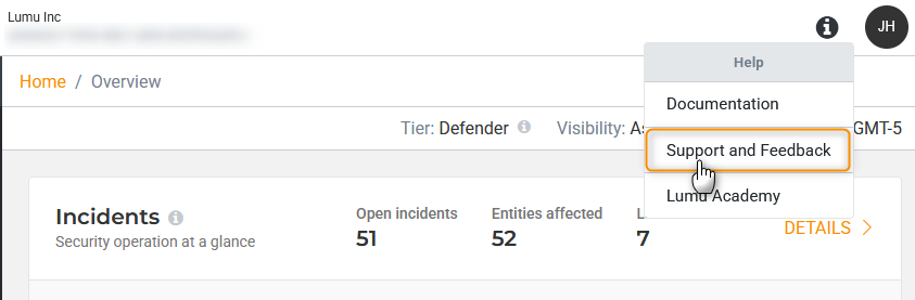 If after doing so you still have a question or need help, we would be happy to point you in the right direction. To request help or provide feedback, go to the Lumu Portal and navigate to Help > Support and Feedback: