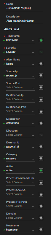 Name Lumu Alerts Mapping Description [Optional] Timestamp timestamp timestamp will ask for Value conversion. Leave as it is and click on the Apply button.Severity Severity Fill in the mapping values by using this guide [map the values] (Critical: Critical, High: High, Medium: Medium, Low: Low)Alert Name Name Source IP source_ip Description description External Id external_id Category category Action action Fill in the mapping values by using this guide [map the values] (Reported: Reported , Blocked: Blocked)Hostname hostname