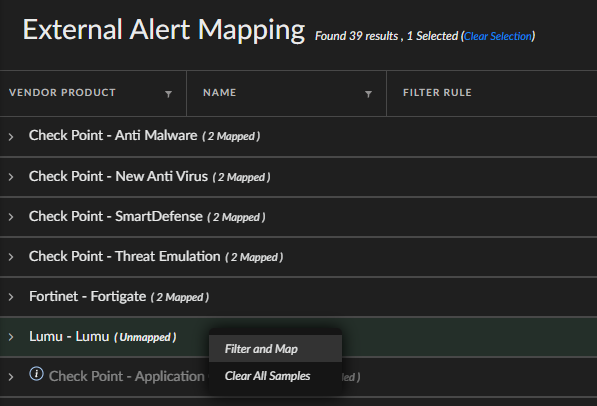 1. Look for the Lumu Lumu row and right click over it. Then, click on the Filter and Map option2. On the Lumu screen, you will see the sample alert. Click on the Next button.3. Fill in the mapping fields according to the following table