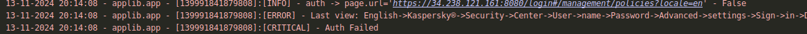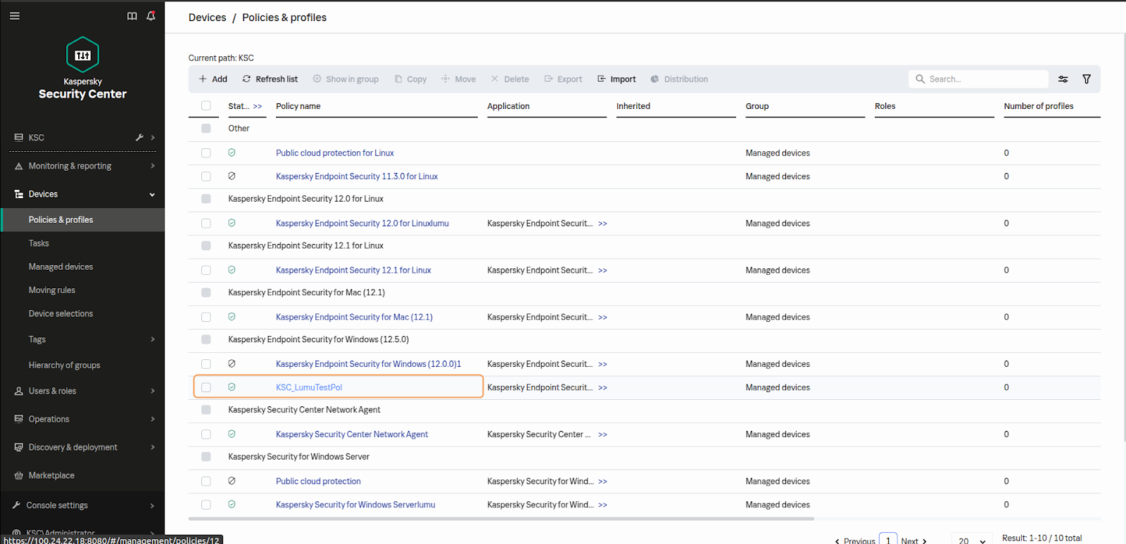 Check if the integration’s user permissions allow it to open the Policy section in the Kaspersky Endpoint Security Console and if the name of the policy included inside the configuration files matches with the Kaspersky policy, making sure it doesn’t include any invalid characters.