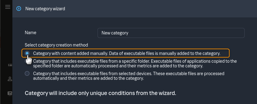 2. Fill in a descriptive Name for the category. Under the Creation method select ”Category with content added manually. Data of executable files is manually added to the category.”. Click on the Next button.