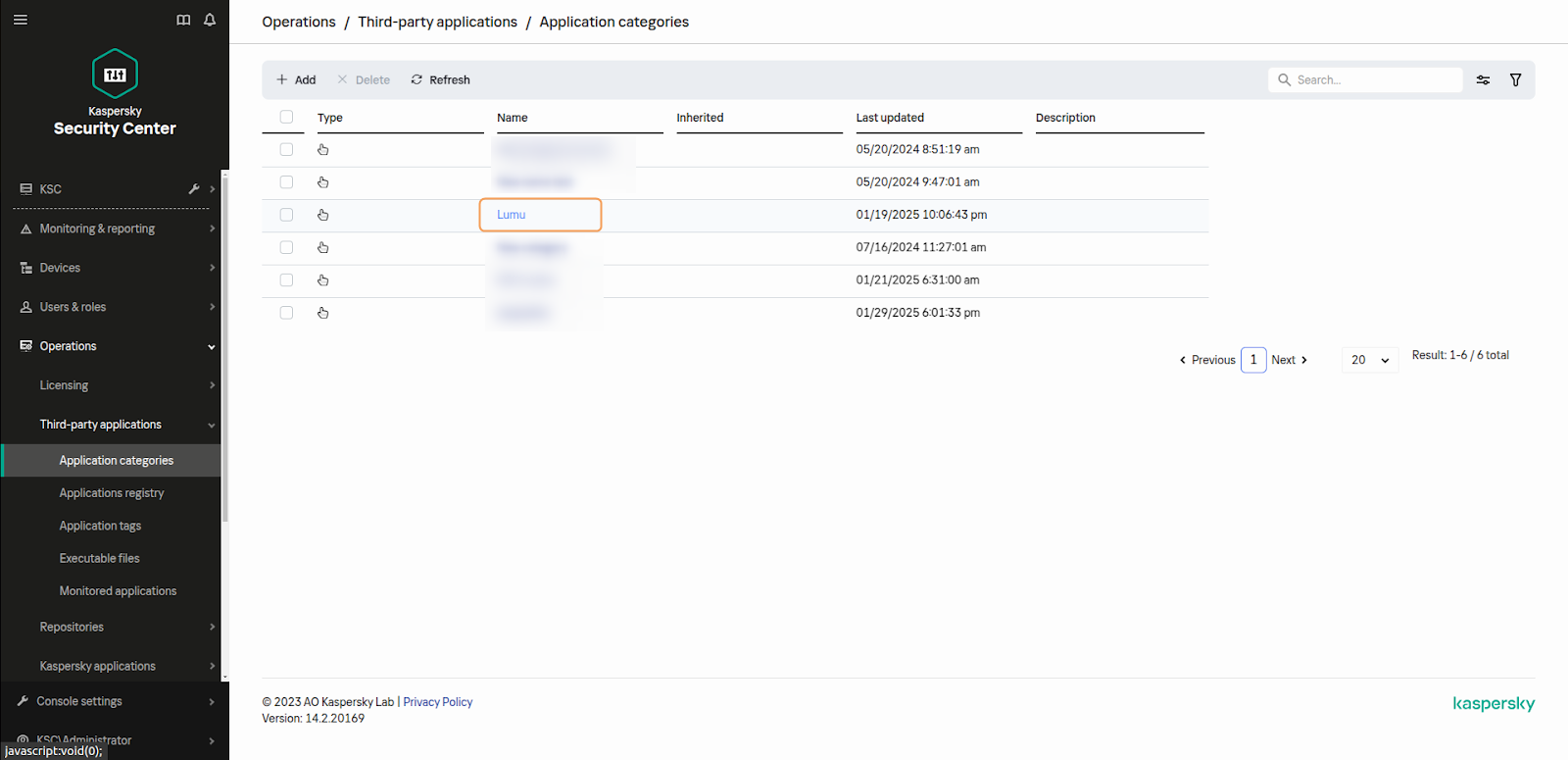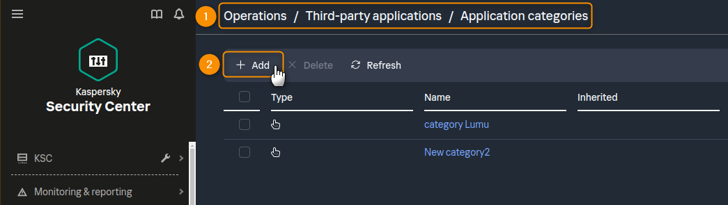 1. On the KSC’s Web console navigation bar, click on the Operations > Third-party applications > Application Category menu. Then, click on the Add button.