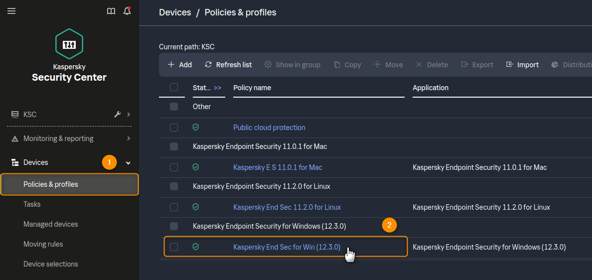 1. Click on the Policies & profiles menu under the Devices section in the main navigation bar. Then, click on the policy you want to manage.