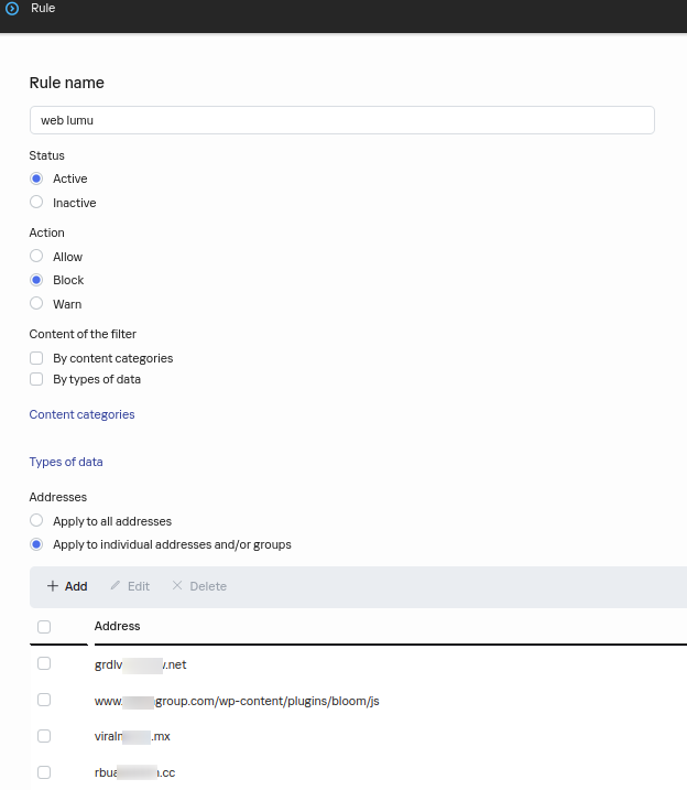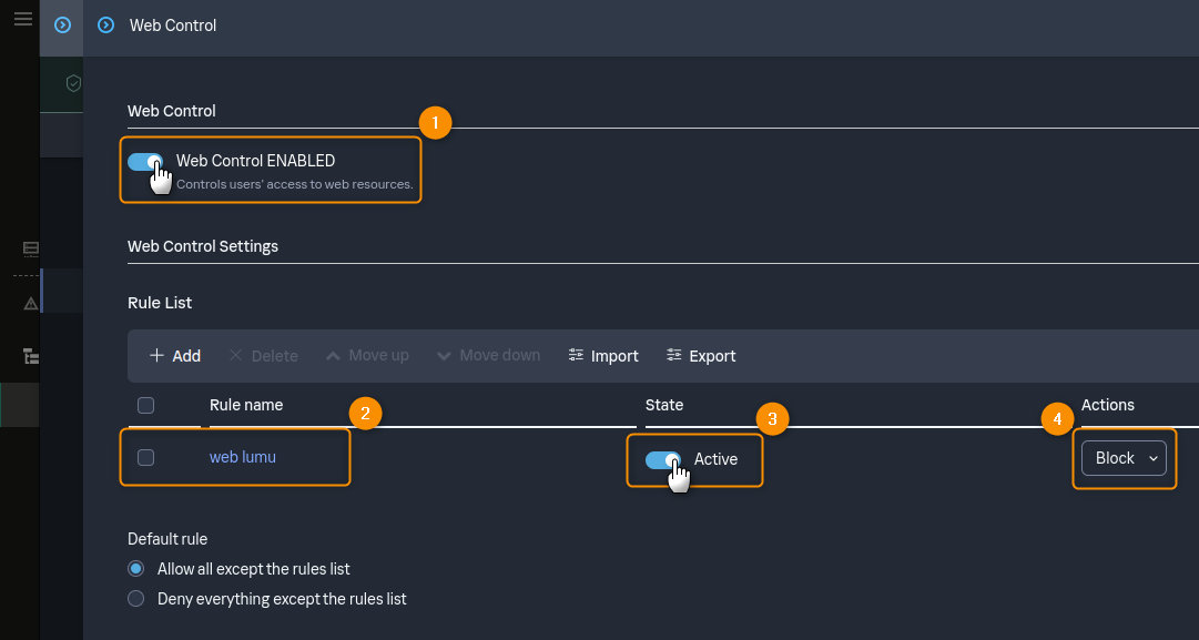 3. Enable the Web control toggle. Then, either select an existing Web control policy or create a new one. Set up its Action to Block. You can use canary.lumu.net as the base address for your rule.