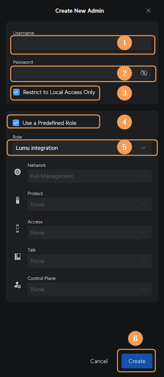 2. Fill in the information in the Create New Admin section on the right side of the window. Follow these guidelines:a. Type your integration Username(1)b. Give your integration user a secure Password(2)c. Ensure the Restrict to Local Access Only(3) toggle is enabled.d. Enable the Use a Predefined Role(4) toggle ande. Select the Role(5) you created in the Create a dedicated integration role section.e. When you are ready, save your integration user by clicking the Create(6) button.