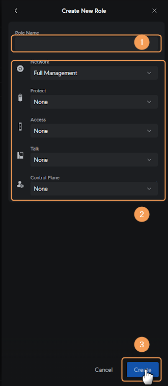 4. Create your integration role by following these guidelines:a. Enter a distinctive Role Name(1).b. Select the Permissions(2) for each application. Ensure that the Network application has Full Management selected. The rest of the applications must be set to None.c. When finished, save your integration role by clicking on the Create button.
