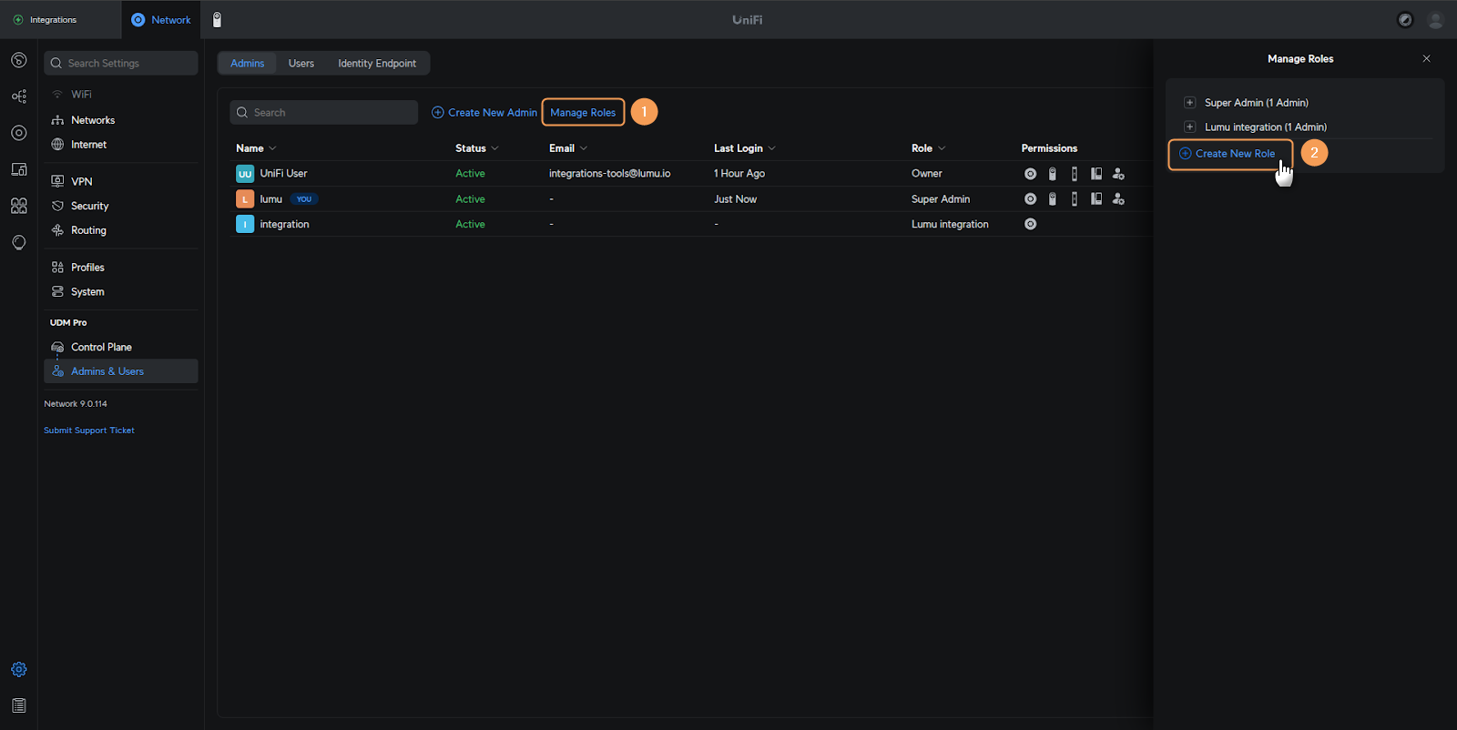 3. In the Admins window, click the Manage Roles(1) button next to the search bar. The Manage Roles section will appear on the right side of the Window. Click on the Create New Role(2) menu to create your integration role.