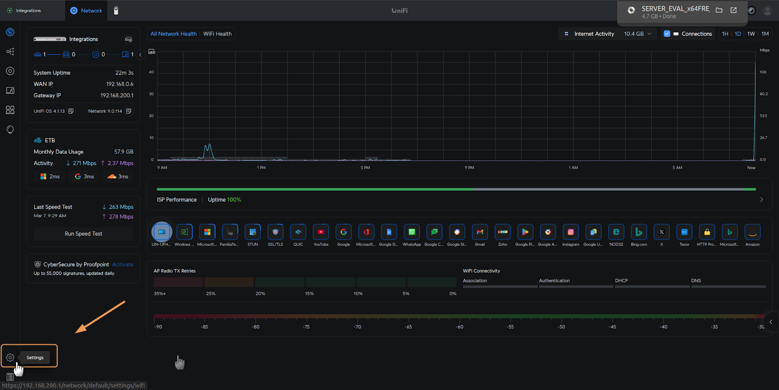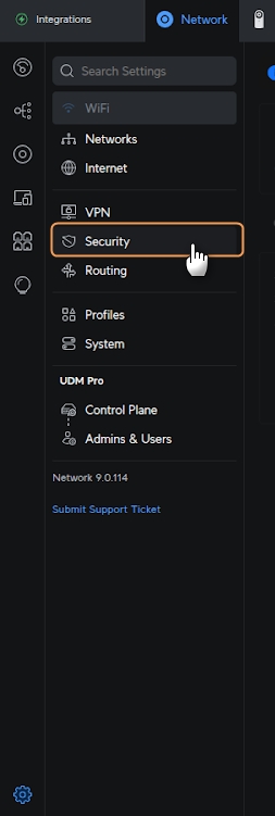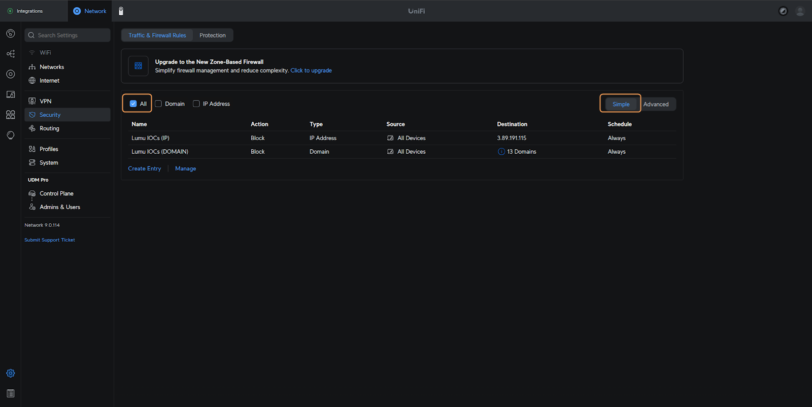 1. Head to the left navigation bar. Click on the Settings menu (the Gear icon).2. Head to the Settings navigation bar. Click on the Security menu.3. The Lumu rules are listed under the Traffic & Firewall Rules window. Ensure the Simple option and the All toggle are enabled.