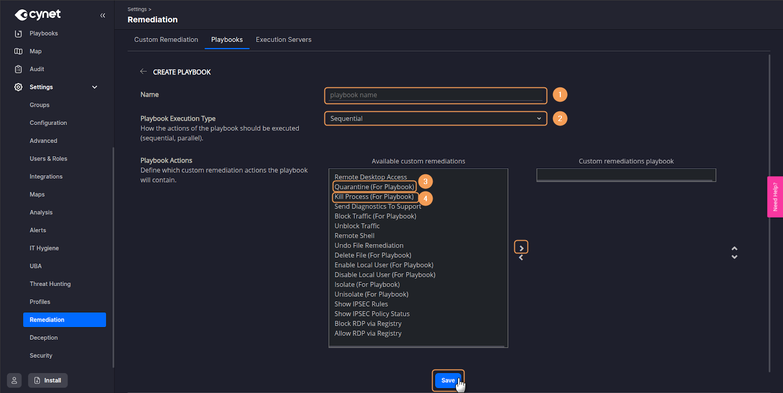 3. In the CREATE PLAYBOOK window, fill in the required information. Follow these guidelines:a. Give a Name(1) to the playbookb. Set the Playbook Execution Time(2) to Parallelc. Under the Playbook Actions section, select and move the Quarantine (For Playbook)(3) and the Kill Process (For Playbook)(4) available custom remediations to the Custom remediations playbook sectiond. Click on the Save(5) button