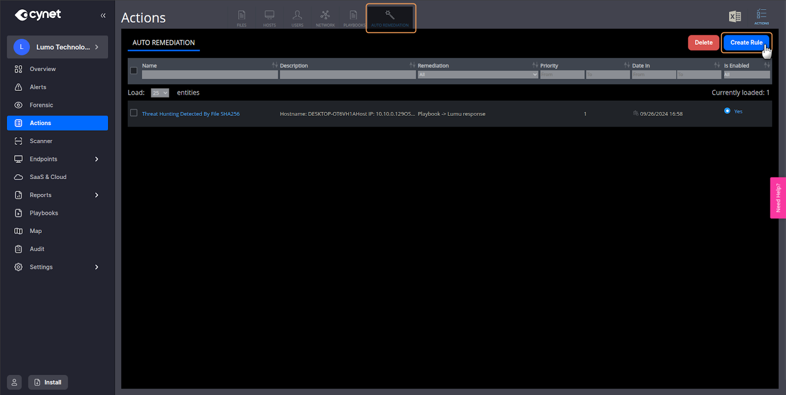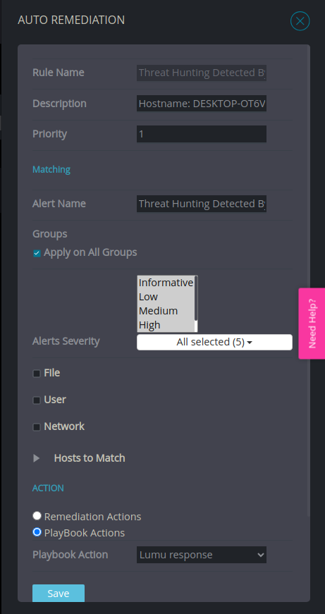 You can define remediation playbooks for your Lumu alerts and create actions to remediate them automatically. Next, you will find examples for a remediation playbook and an auto remediation rule.