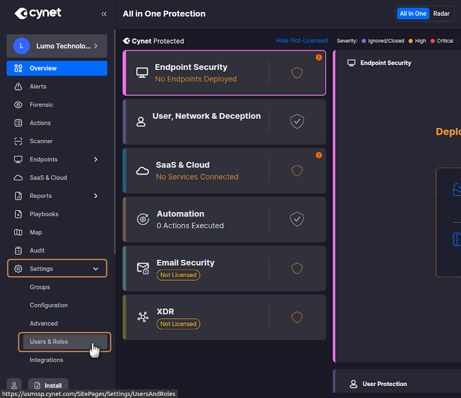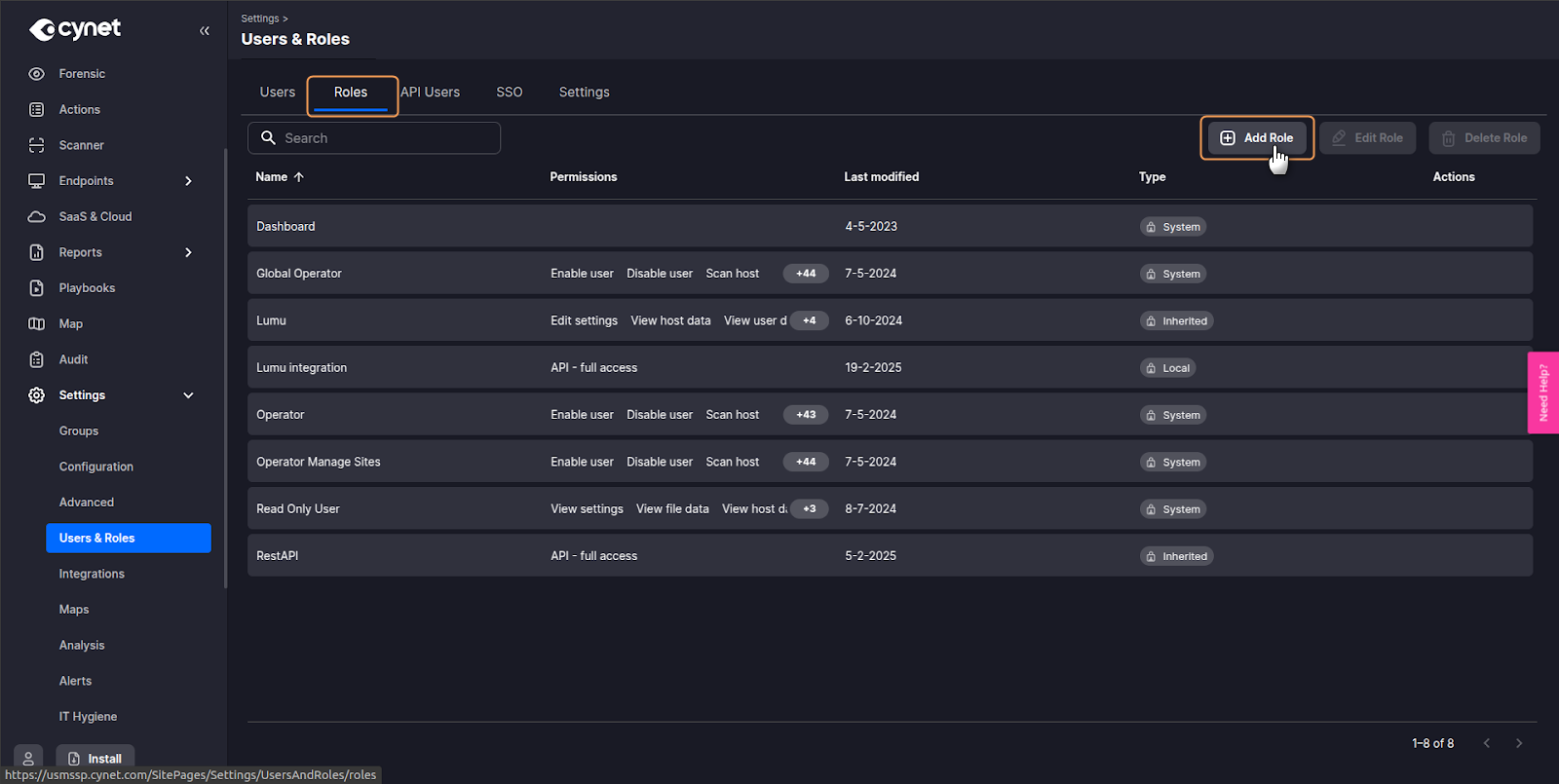 Follow these steps inside your Cynet console to create it.1. In your account window, head left to the navigation bar, expand the Settings section and click on the Users & Roles menu.