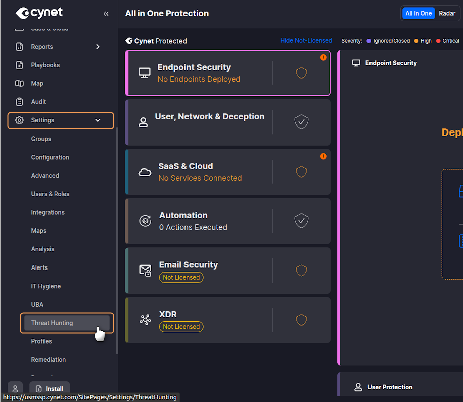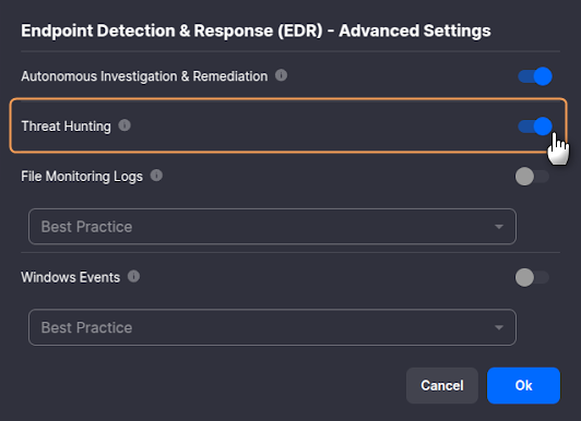 The Threat Hunting feature must be enabled to make the integration work. To enable this feature, follow these steps inside your Cynet console:
