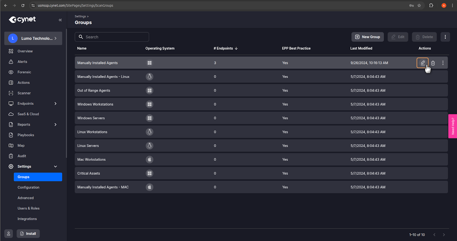 2. In the Groups window, look for the required endpoint group and click on the Pencil icon to edit it. In this example, the icon is displayed on “Manually Installed Endpoints”.