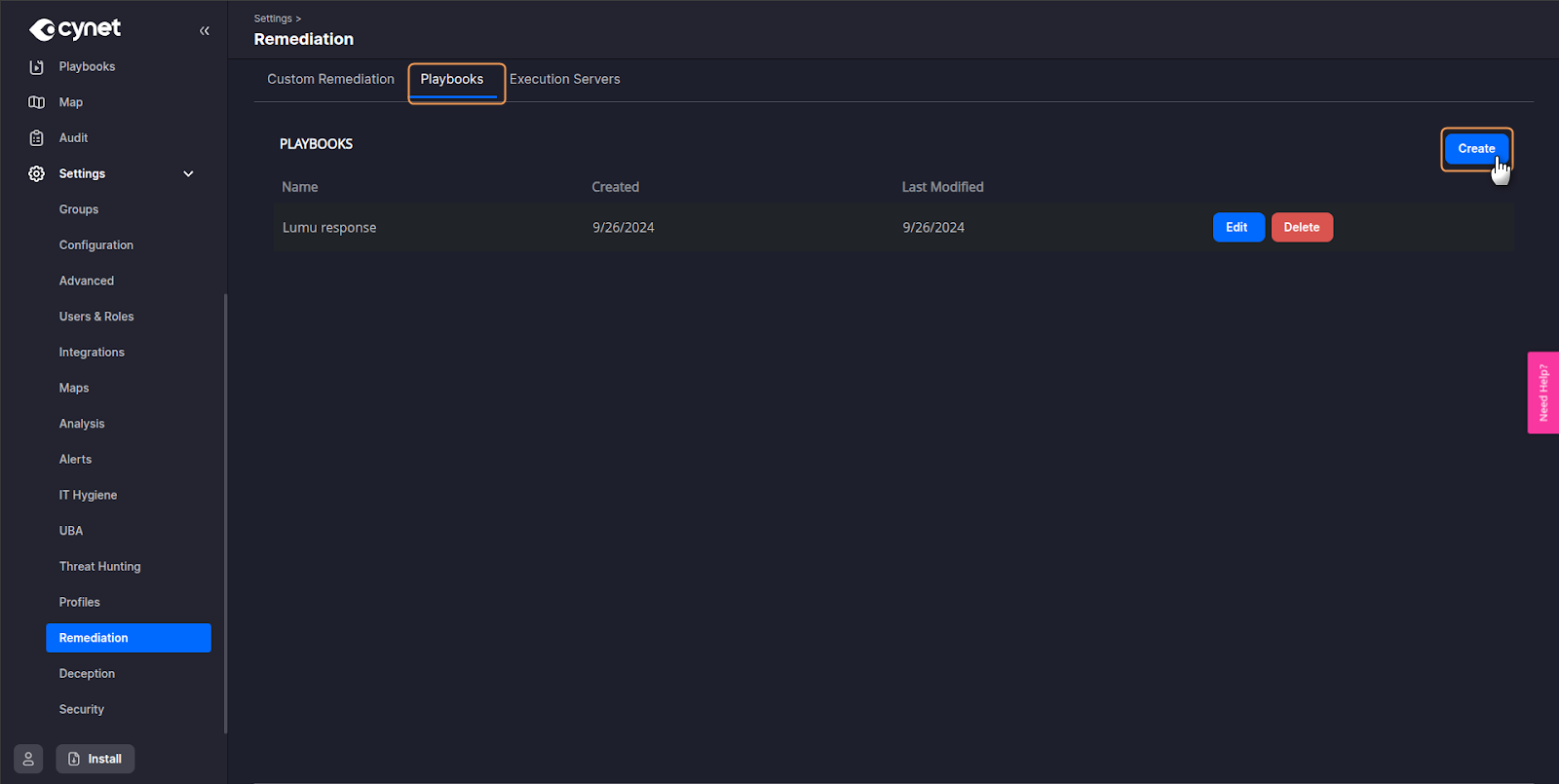2. In the Remediation window, move to the Playbooks tab. Click on the Create button